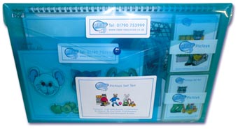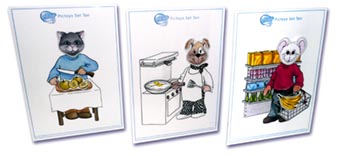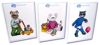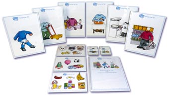 set includes six A4 size verb boards, 3 characters, 12 objects,